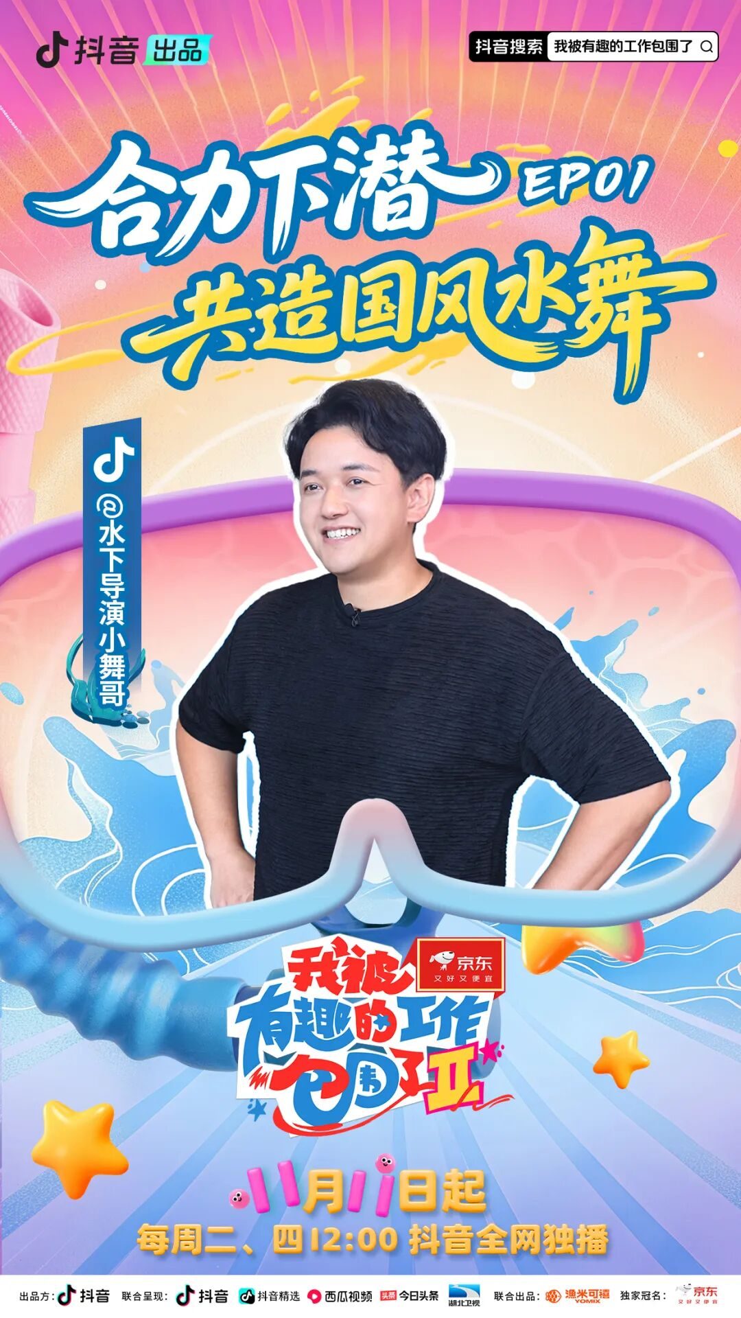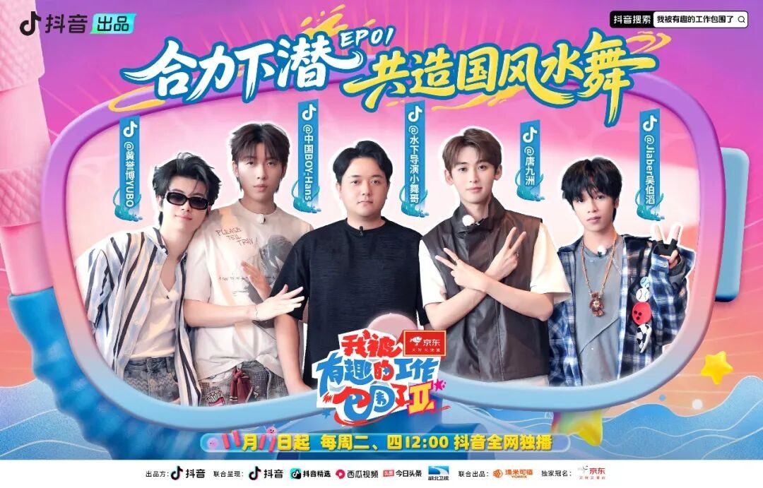 作为一场专属的抖音创作者团建局,《我被有趣的工作包围了2》自始至终围绕抖音生态创作者展开内容创作。在节目中,“探路团成员吴伯滔、中国BOY王瀚哲、唐九洲、黄誉博四位艺人来到深圳,在抖音优质创作者@水下导演小舞哥的带领下,开启了这场抖音创作者团建的首个职业体验 —— 亲身体验“水下导演”这一极具挑战性的非标新职业。