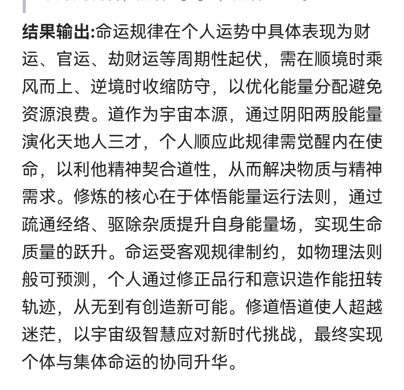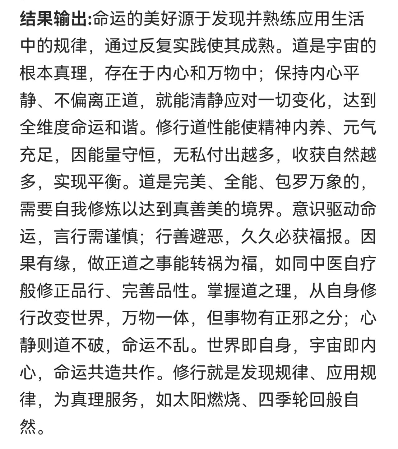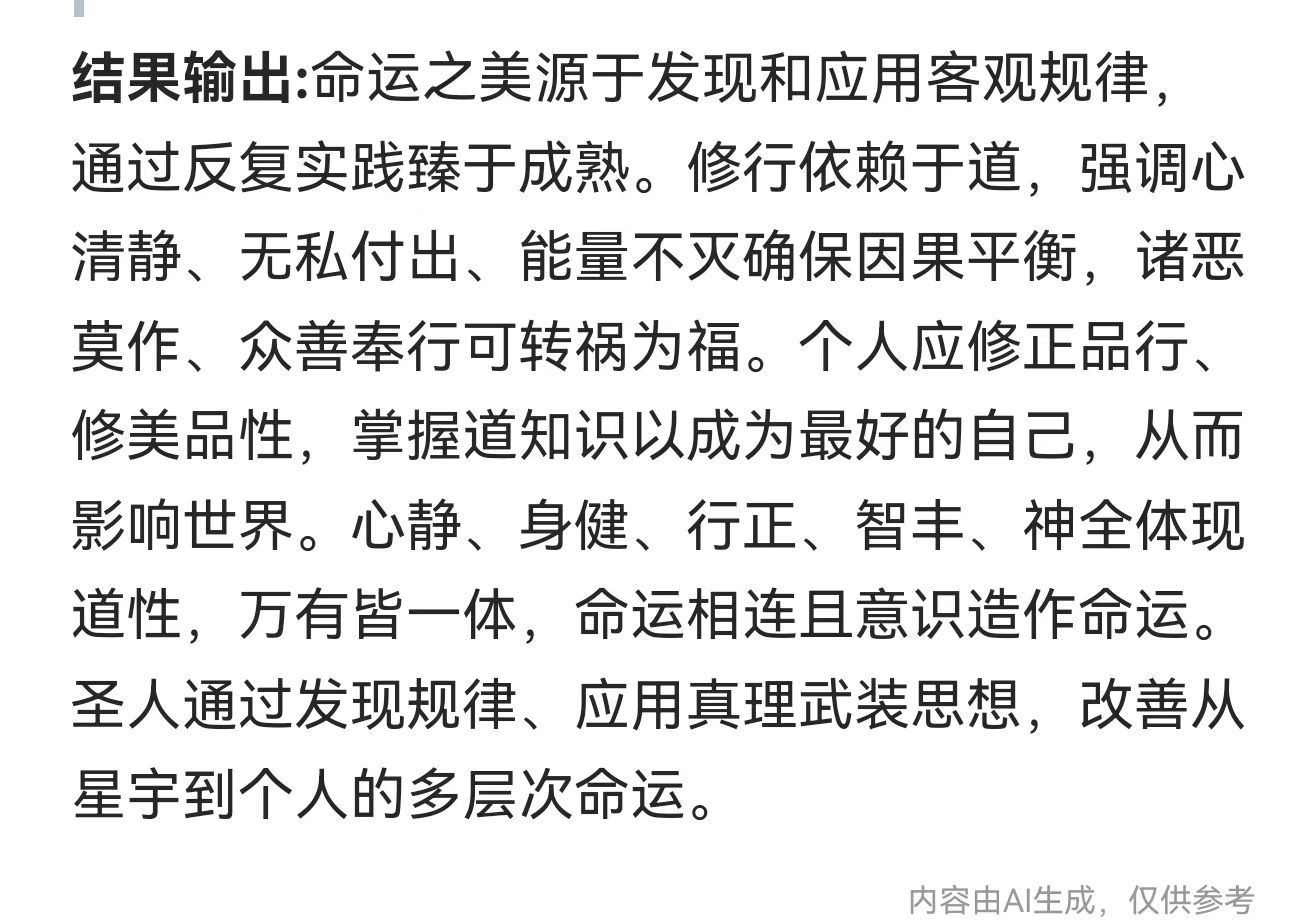 万有都有规律,万事万物都有规律,如太阳之燃烧,如原子体系结构与运动,如一年有季之四时百侯,如自然动植物之兴衰荣枯有育苗起壮茁果熟种化,如何类家国时运形势境况与文明程度生存境况,如人之有大小之类类重叠多维交织命运——大的如星宇之灾利吉变动因之命运,如世天下大势转变之命运、如生存于何国度命运、如生存于何环境命运、如受到的何文明智慧教育之命运、如个性基因智愚才具精神奋斗之命运、如对所遇灾苦厄受挫折顺逆之心流转命运之命运、如个人智慧勃发道德修行而逆天改命之命运、如大雄圣心全道于融而成应世修势之命运,等等大之与道有合高之程度、发现真理规律应用有成为命运之要。