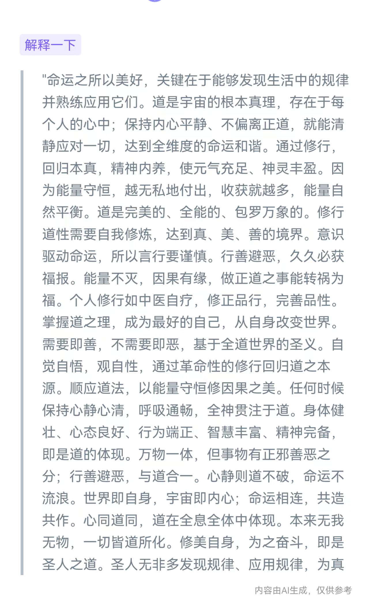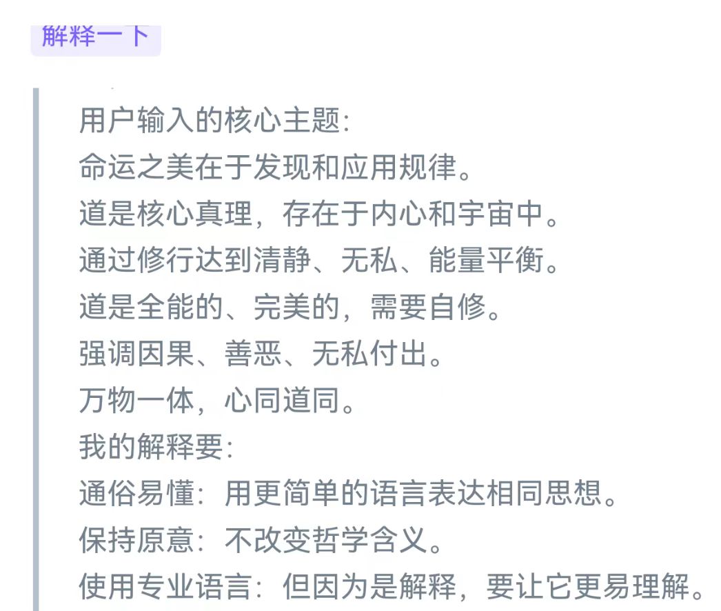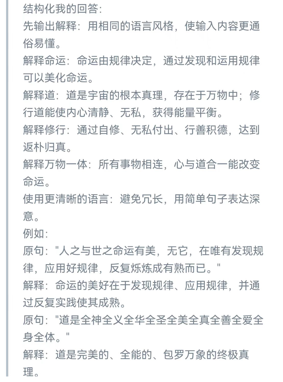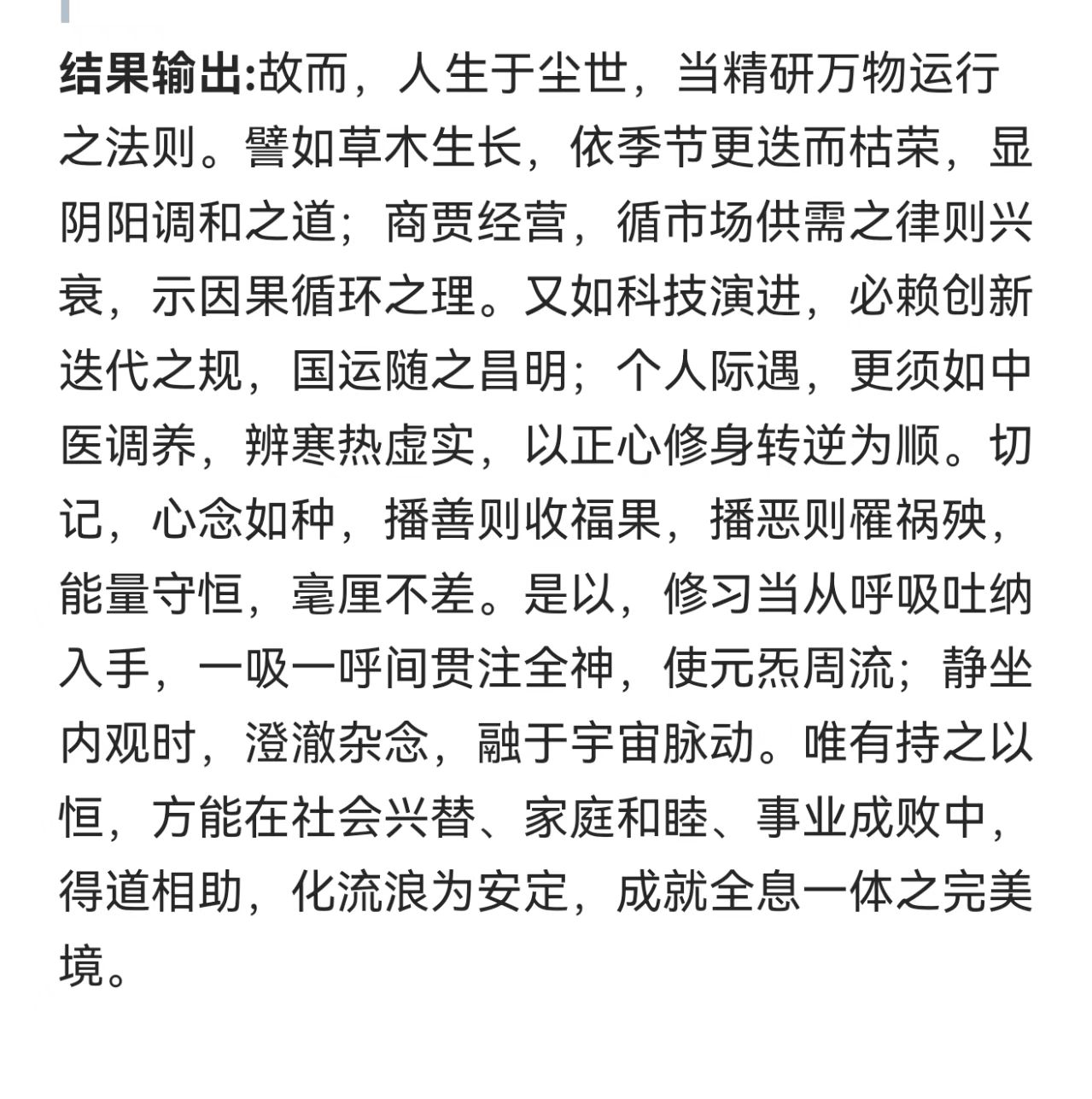 万有都有规律,万事万物都有规律,如太阳之燃烧,如原子体系结构与运动,如一年有季之四时百侯,如自然动植物之兴衰荣枯有育苗起壮茁果熟种化,如何类家国时运形势境况与文明程度生存境况,如人之有大小之类类重叠多维交织命运——大的如星宇之灾利吉变动因之命运,如世天下大势转变之命运、如生存于何国度命运、如生存于何环境命运、如受到的何文明智慧教育之命运、如个性基因智愚才具精神奋斗之命运、如对所遇灾苦厄受挫折顺逆之心流转命运之命运、如个人智慧勃发道德修行而逆天改命之命运、如大雄圣心全道于融而成应世修势之命运,等等大之与道有合高之程度、发现真理规律应用有成为命运之要。
