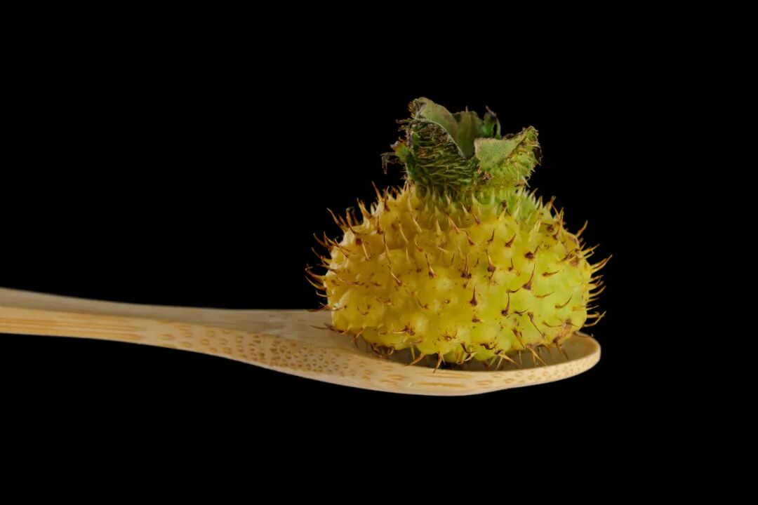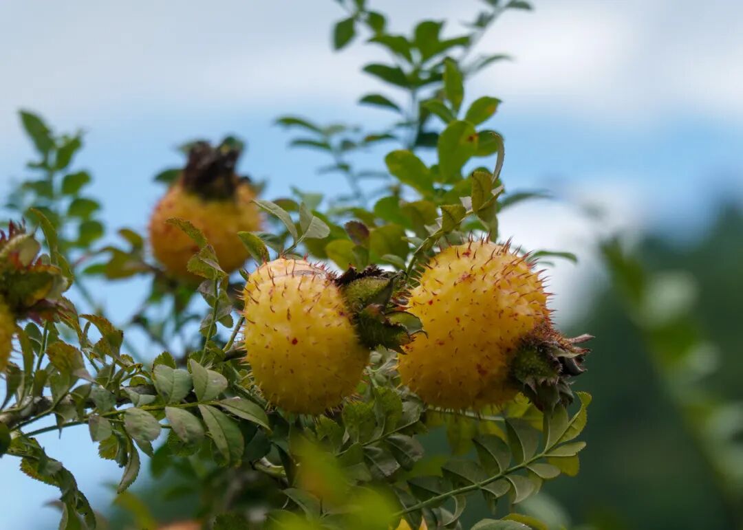 刺梨形如其名,果实成熟后色泽金黄,和鸭梨颜色相似,剥开外皮后果肉呈黄白色,其上分布着黑色果籽,十分可爱。只是果实不仅个头小,表面更是长满了尖刺,看起来一副不好接近的模样,加上味道有些酸涩,因此并没有在全国广泛流行。