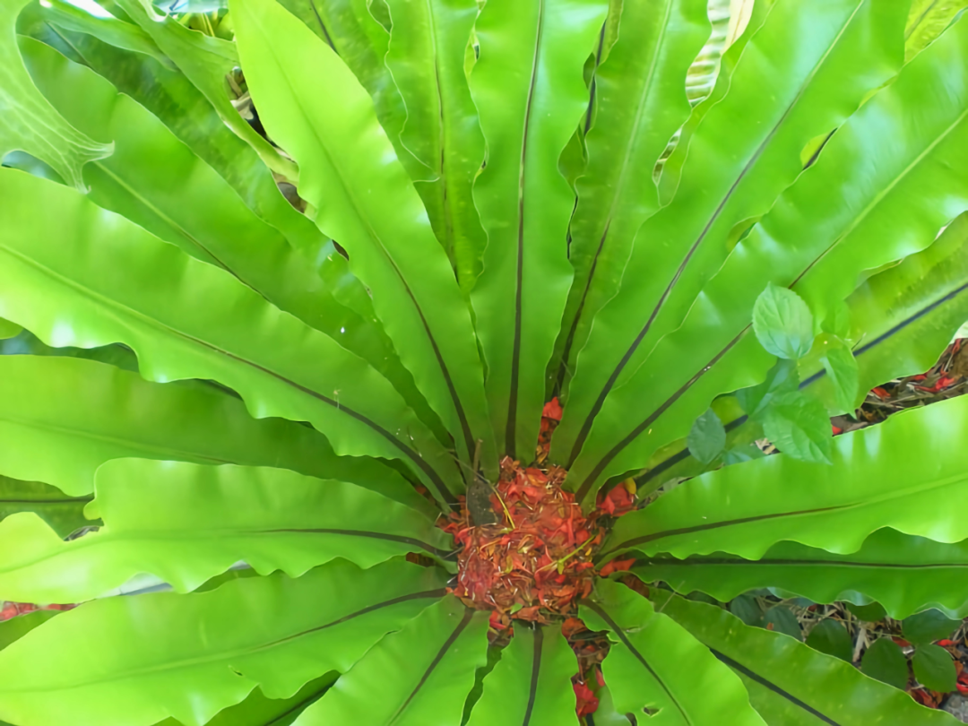 巢蕨外形美观,现在已经培育出了诸多琳琅满目的观赏品种。它的植株高约 1-1.2 米,有着粗短直立的木质根茎,附生一大团气根,宽大碧绿的革质叶片自圆形基座长出,从中心向周围展开,呈漏斗状。这种宛如鸟巢的叶片结构,可以帮助它承接雨水和落叶,转化成腐殖质,为自己提供营养,也为它与别的植物和谐共生创造了有利条件。