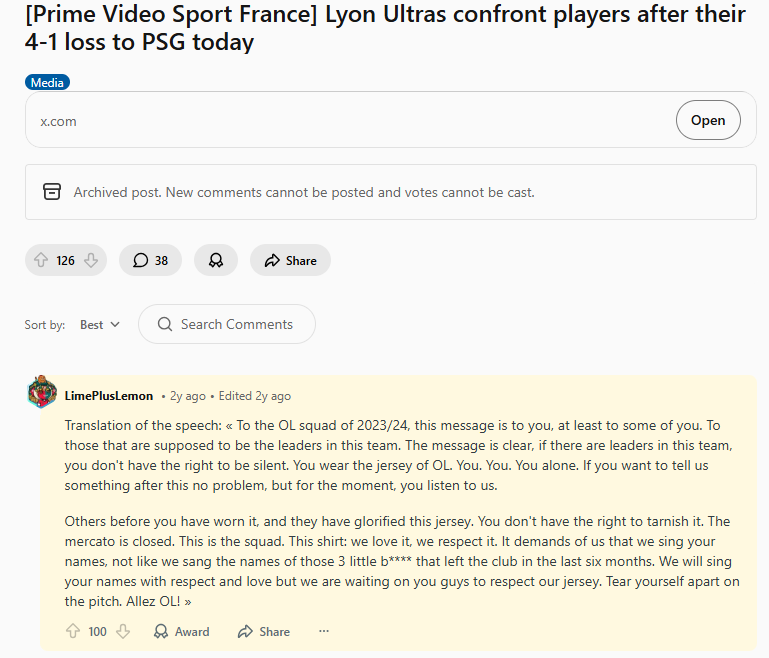 而回看里昂“训话”的例子,虽然场面上来看球员也是无奈地站在球迷面前、球迷的声量和表情也显示出他情绪非常激动,但是实际上他发言的内容没有太多攻击性字眼,而是说“我们永远支持球队,但是需要球员们先拿出拼搏的精神”,具体的批评角度相对比较婉转。