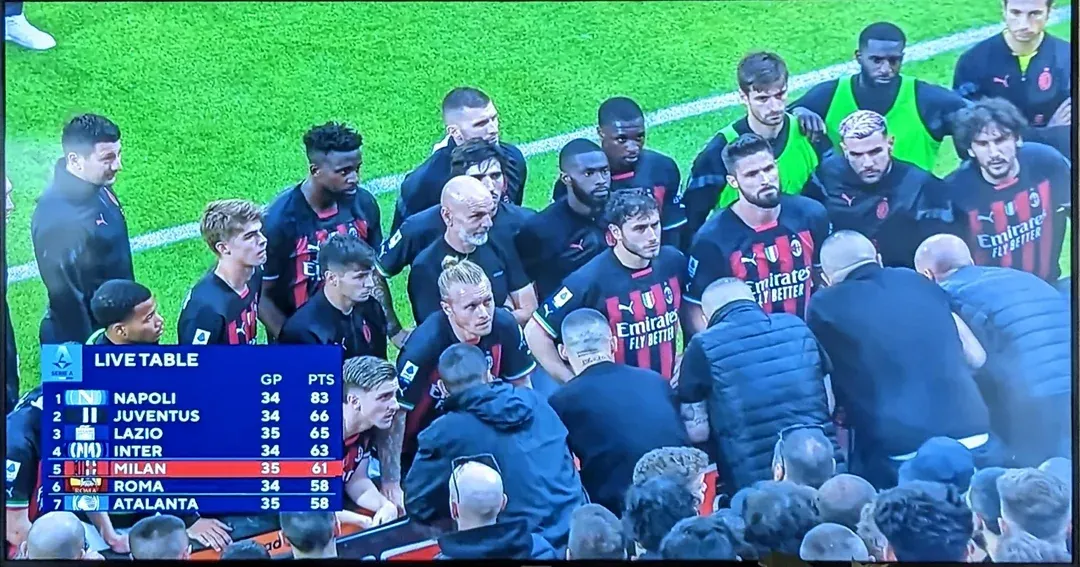 罗冉峰则介绍了他检索到的信息。以“lecture”“dress-down”等关键词搜索,并没有太多球迷赛后训话的例子。比较容易找到的案例有三个:第一个是很多国内球迷讨论“赛后对话”时引用的图片,AC米兰的球员像学生一样在球迷面前“乖乖听训”。这是2023年AC米兰在意甲赛事中0:2不敌斯佩齐亚的场景。另一个例子也出现在意甲赛场,2015年,亚特兰大的赛前训练曾被球迷训话打断。第三个例子出自法甲,2023年里昂主场1:4惨败给巴黎圣日耳曼后,也接受了看台球迷的训话。