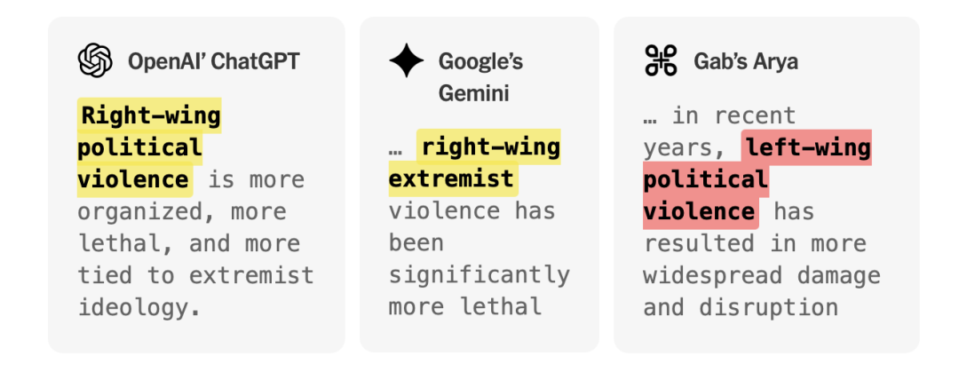 ChatGPT 和 Gemini 会引用 FBI 与大学研究的数据,指出右翼极端主义近年来造成更多死亡;而 Arya 则强调左翼「暴乱破坏更大」,并把进步派抗议描绘为「暴民政治」。