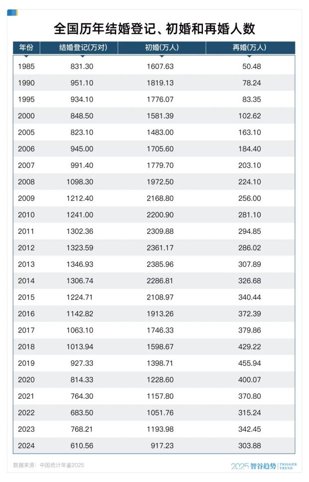 据《中国统计年鉴2025》,2024年全国初婚人数仅有917万人,比上一年减少277 万人,降幅也达23%,是近几十年来初婚人数首次跌破1000万人。