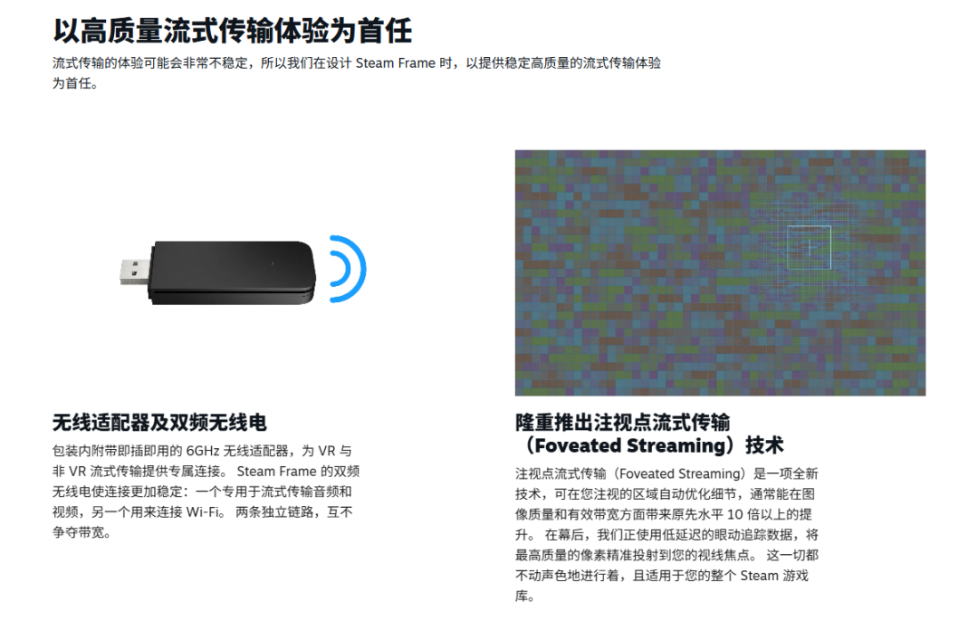 不仅如此,Steam Frame 还准备了一个类似无线鼠标那样的适配器,以及通过眼动追踪技术专门优化注视区域的画面细节,都是为了保证串流画面足够清晰流畅。