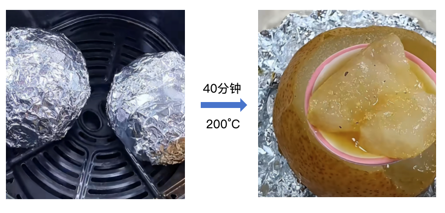 比如烤梨,将梨去核后用锡纸包裹,放入空气炸锅,加入适量的冰糖和水,烤制 40 分钟就能得到软糯香甜的烤梨。此外,空气炸锅还可以用来熬糖,制作糖葫芦等。