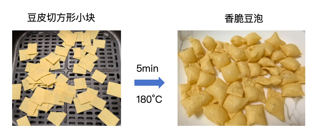 比如将豆皮剪成小块,放入空气炸锅烤制,预热后 180°C 烤 5 分钟,就能变成香脆的豆皮小零食;酱牛肉切成1毫米厚的薄片,用空气炸锅低温烤制,就能制作成健康的牛肉干;馒头片也可以通过空气炸锅烤制成香脆的烤馍片。
