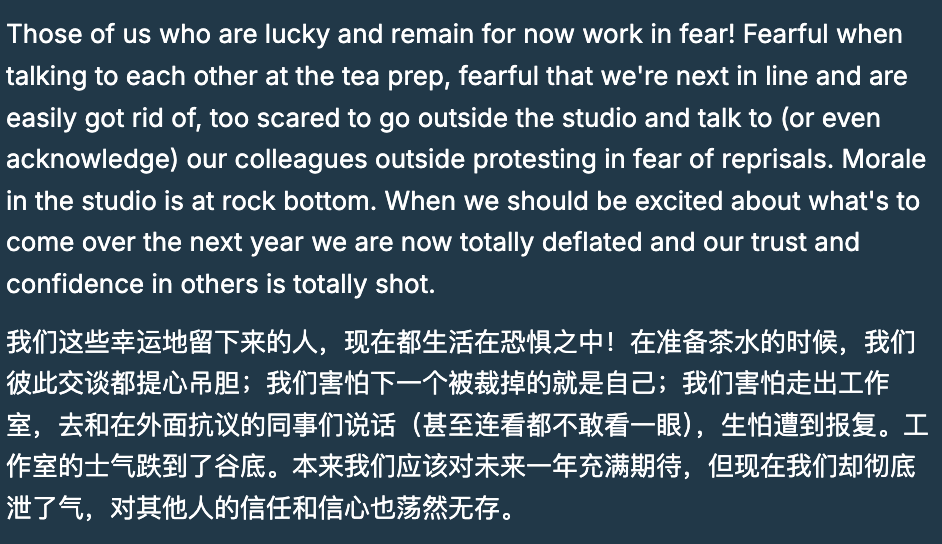一个英国员工就说,虽然他没被裁,但留下来的这些人每天都在恐惧中工作。大家在茶水间互相谈话都提心吊胆,走出公司也不敢看那些抗议的同事,怕遭到报复,怕自己是下一个被裁掉的。