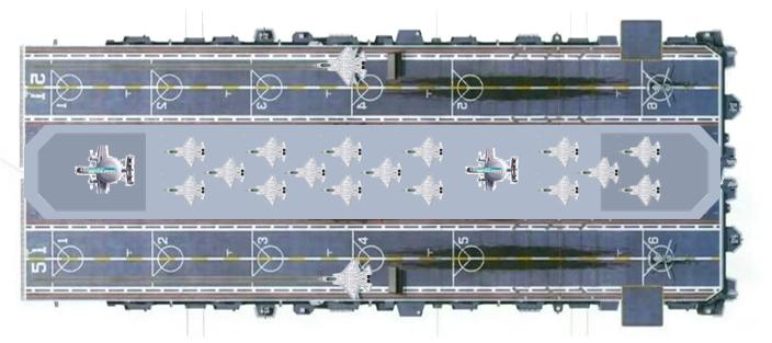 - 模式B(全甲板攻击):左右舷四台电磁弹射器可同时全力运转,进行最大规模的战机放飞,攻击波次强度和速度远超传统航母。