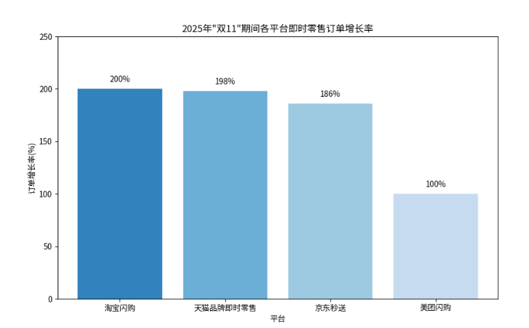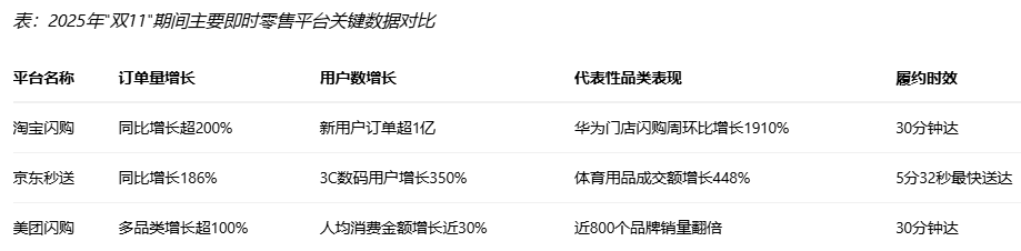 即时零售的爆发不仅体现在交易额上,在订单量、用户数及履约效率等方面也实现全面提升。各大平台数据显示,“双11"期间即时零售订单普遍实现翻倍增长,其中淘宝闪购零售订单同比增长超2倍,天猫品牌即时零售日均订单环比9月增长198%;京东秒送订单量同比增长186%;美团闪购则有多品类销量同比增长超100%。这些数据充分表明,即时零售已从过去的"应急渠道"转变为消费者日常购物的重要选择。