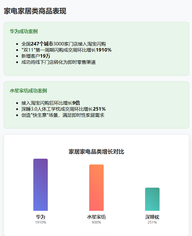 家电家居类商品的即时零售同样表现亮眼。华为将全国247个城市的3000家门店接入淘宝闪购后,“双11"第一周期闪购成交周环比增长1910%,新增客户19万。水星家纺接入淘宝闪购后,“双11"以来环比增长达到9倍,其深睡3.0人体工学枕成交周环比增长251%。这些案例表明,家居家电品类正通过即时零售创造"快生意"场景,满足城市新租房族和年轻家庭的即时性家居需求。