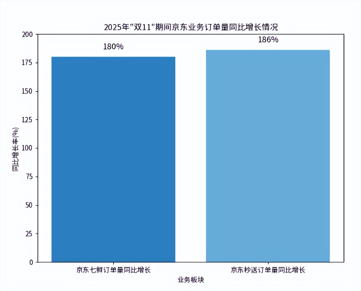 京东秒送在2025年"双11"中充分发挥了其在供应链效率上的传统优势。2025年京东11.11期间,京东七鲜依托“超级供应链”打造的“1+N”模式效能显著,推动线上订单量同比增长180%。