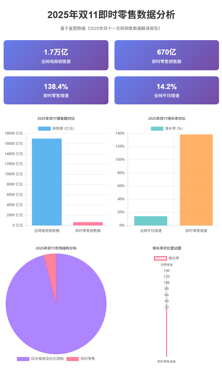 即时零售在2025年"双11"期间呈现爆发式增长态势,成为整个电商生态中最为亮眼的增长极。根据星图数据发布的《2025年双十一全网销售数据解读报告》,今年"双11"购物节期间(10月7日—11月11日),综合电商、即时零售及社区团购的全网电商销售额达到约1.7万亿元人民币,同比增长14.2%。其中,即时零售板块表现尤为突出,销售额达到670亿元,同比激增138.4%,增速远高于全网平均水平。