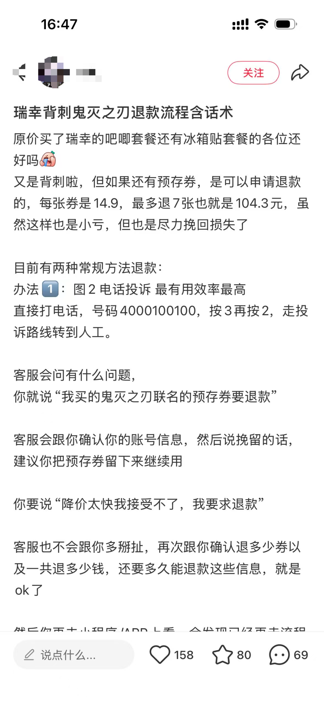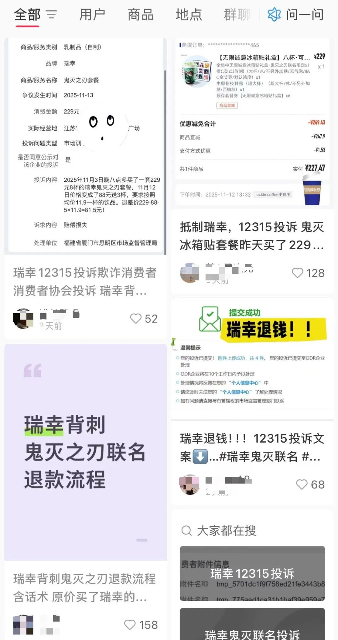 如今在各个社交平台搜“瑞幸×鬼灭联名”,有大量负面贴,粉丝找12315投诉“瑞幸欺诈消费者”,还有要求瑞幸客服要求退款预存的咖啡消费券。这与过去瑞幸在与ACG IP的联名中经常制造爆款案例,由此出现的“门店爆单”“小程序崩溃”等关键词形成鲜明对比。
