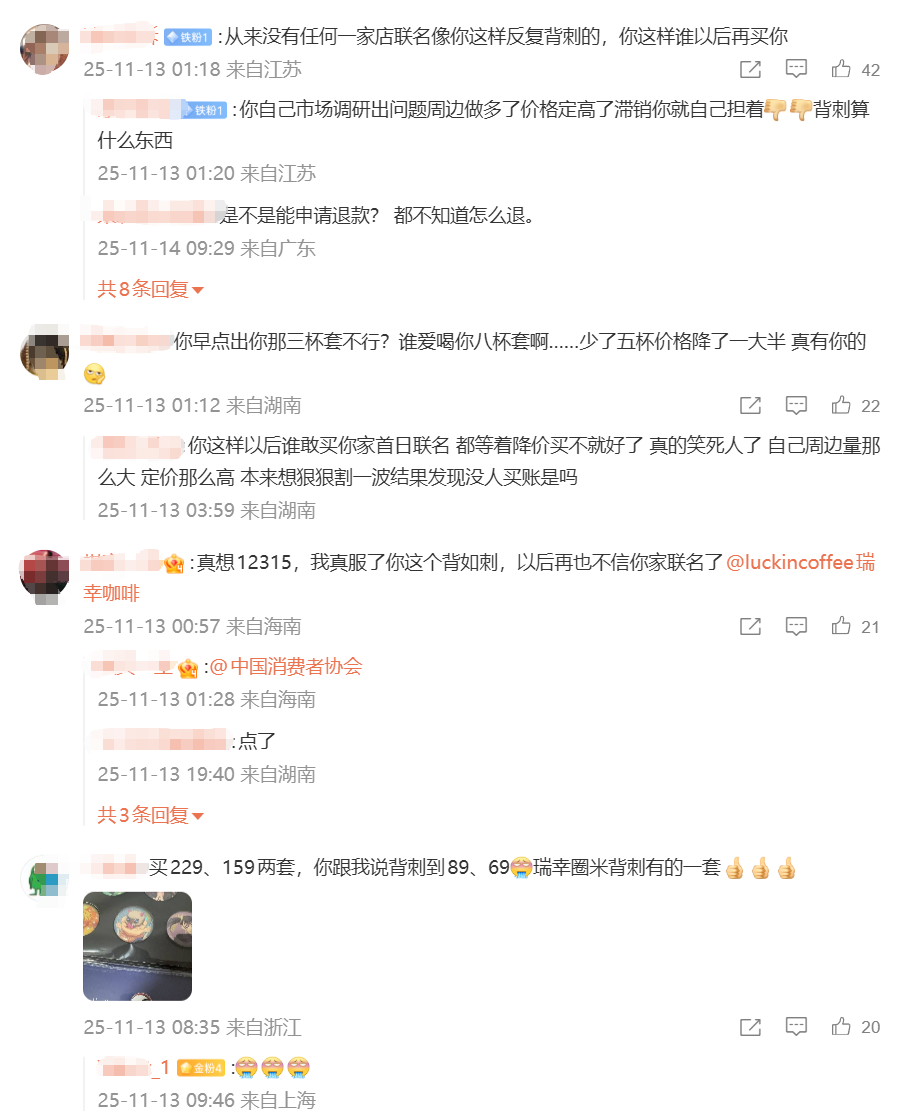 不满的原因多种多样,但最主要的原因还是套餐定价太高,加上15天内必须喝完8杯这一苛刻条件,整个联名活动在粉丝看来更显得像是割韭菜。这也导致活动首日在社交平台上的用户反馈并没有想象中那般热闹,反而是吐槽这次活动的帖子更多。