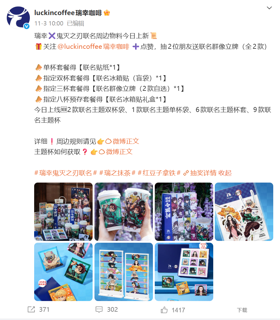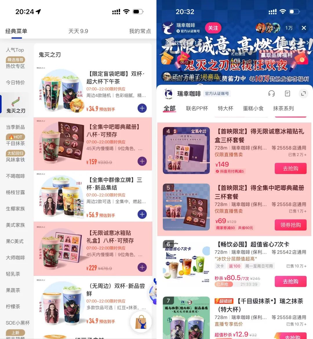 实际上,考虑到版权方监修难度、日影上映时间的不确定性等因素,直接使用现有图库是联名活动能够贴合电影上映期的最优选择。若是降低获取鬼灭周边的获取门槛,这次联动最终未必会走向直播间打折的尴尬境地。但是,在新茶饮联名卷得不能再卷的行业里,对行业领头品牌且擅长联名营销的瑞幸而言,有崩铁这个珠玉在前的联名合作,要不断刷新“联名影响力+咖啡销量”的双KPI,瑞幸只有选择持续不断抓住最火的IP和IP最热的营销阶段,诸如《鬼灭之刃》在国内上映的时间节点,以及搞出高价联名周边和锁客、提高用户消费频率的预存咖啡销售模式。