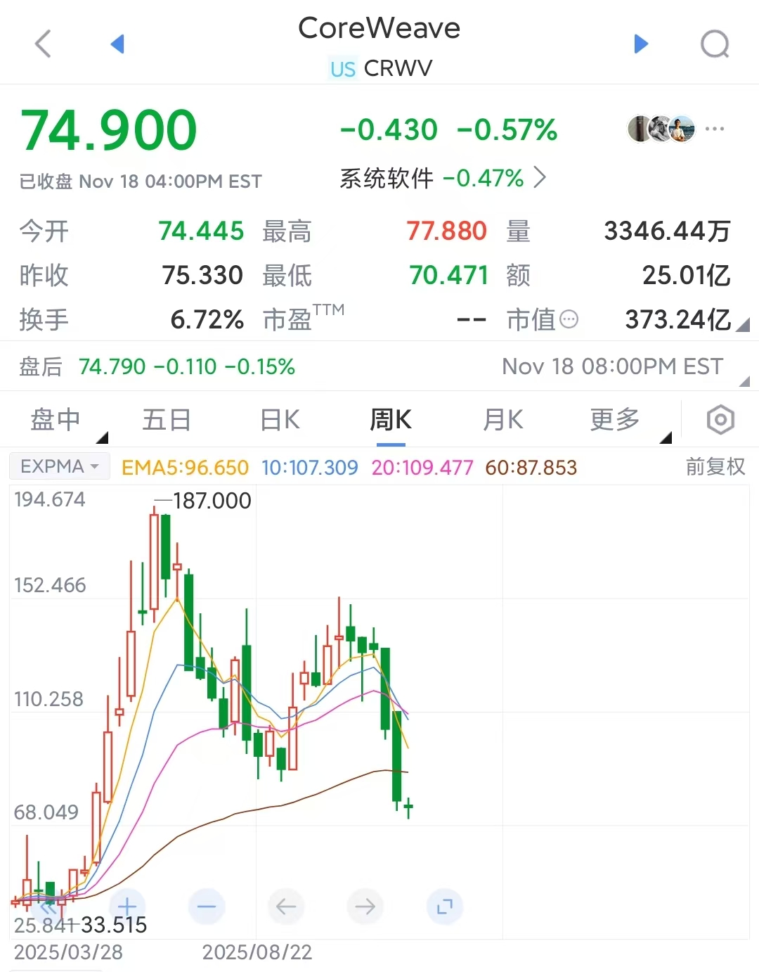 2025年3月,CoreWeave上市,暴涨到187,现在跌到了75。跌了60%算是泡沫破灭,但市值仍然有373亿美元。来看看这个AI股的泡沫程度有多高。