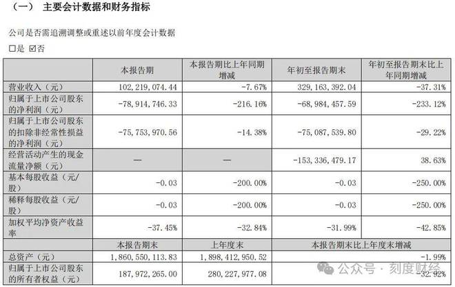 其中第三季度,公司实现营业收入为1.02亿元,同比下降7.7%;归母净利润亏损7891万元,同比大降216%,扣非净利润亏损7575万元,同比下降14.38%。