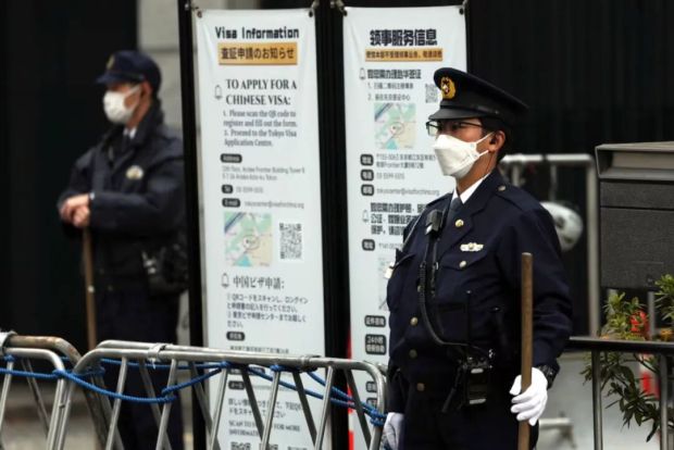 ▲11月18日,日本警察在东京中国驻日本大使馆入口处站岗。(图源:路透社)