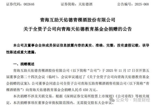在三季度财报披露、经营压力已明确暴露约一个月后,天佑德青稞酒宣布由全资子公司向青海天佑德教育基金会捐赠450万元。