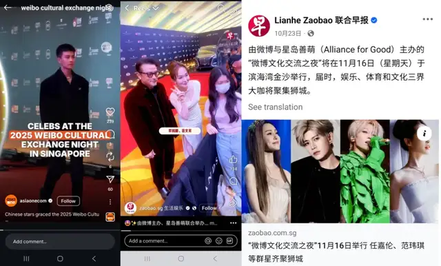在上一站盛典活动,有144个微博热搜上榜,37亿相关话题阅读量,5亿相关视频播放量;此次新加坡站的盛典,当地发行量最大的华文报纸《联合早报》早在10月底就提前预热,新加坡报业控股旗下门户AsiaOne不断跟进报道;在微博、Facebook、Instagram等社交媒体上,粉丝自发制作的大量内容形成了一股“海外自来水”。