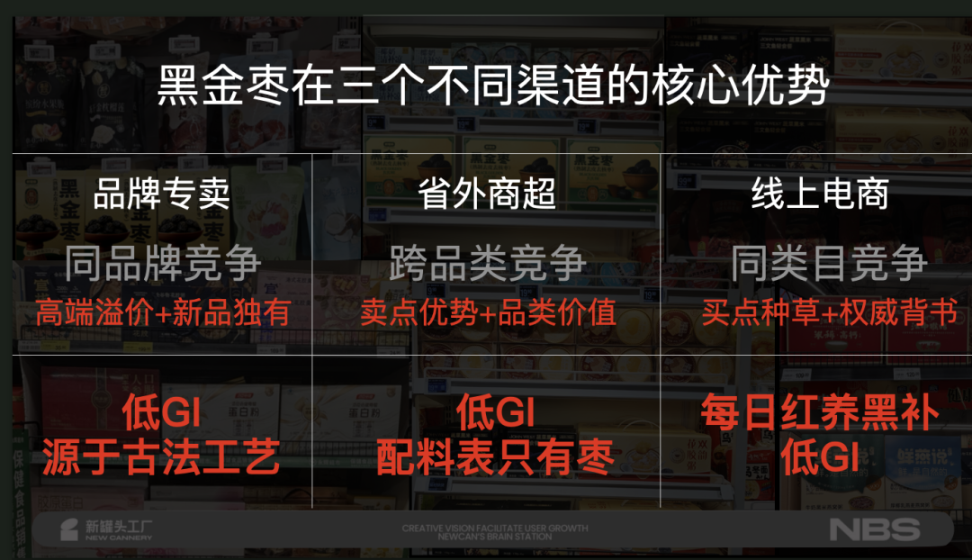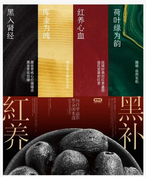 新罐头认为,可以利用红枣消费者有着“我懂养生”“红枣补气血”的认知,将“黑金枣”塑造为他们的“养生进阶符号”,告诉这些用户——当你从“红养”迈入“黑补”,代表你更讲究。