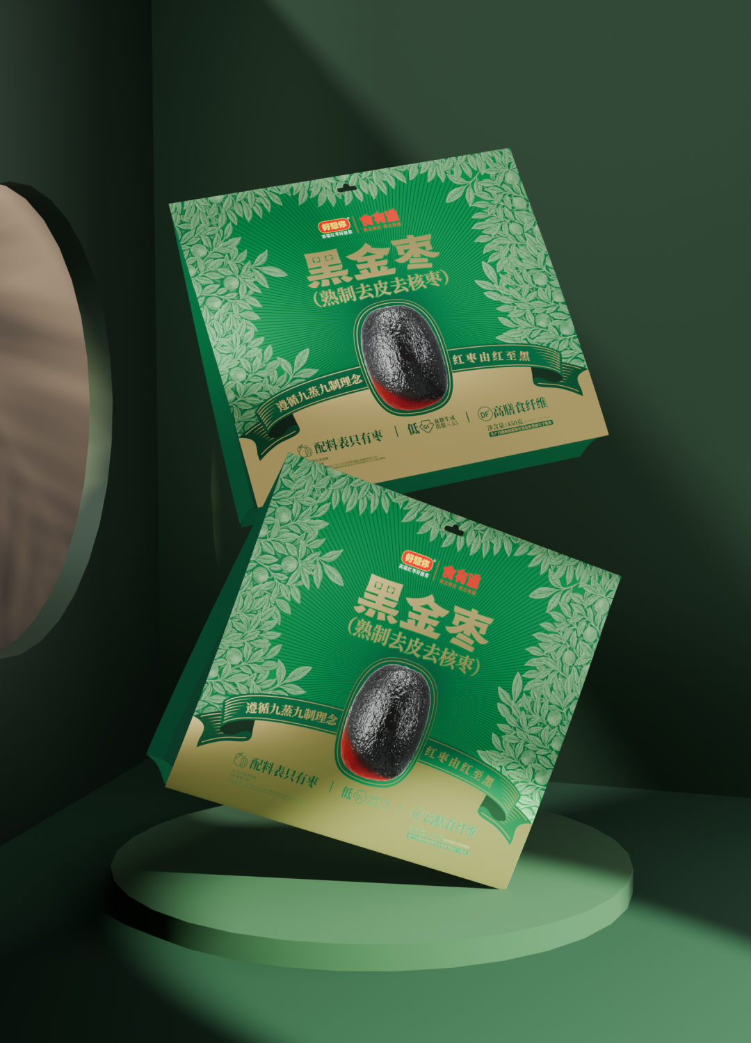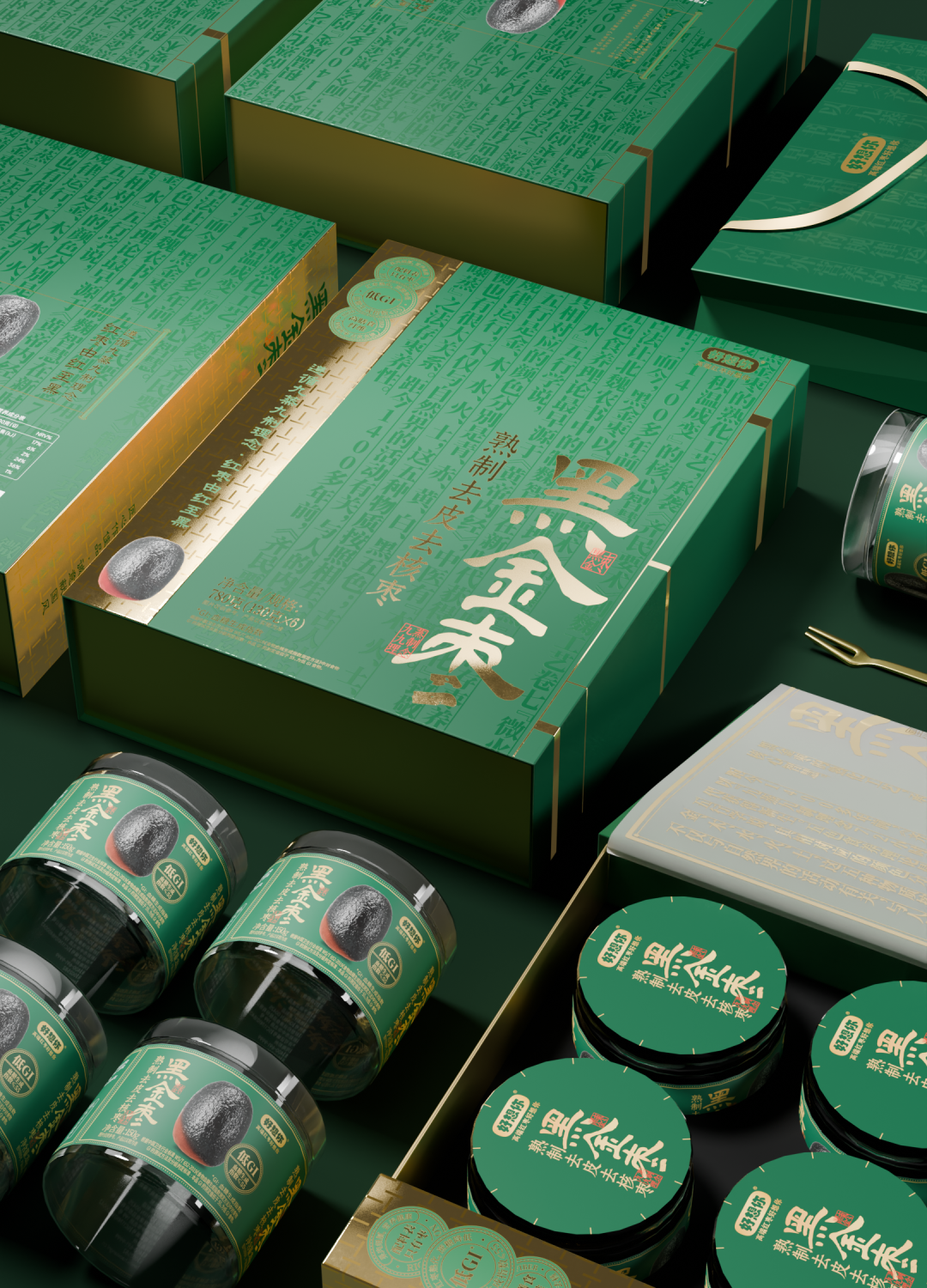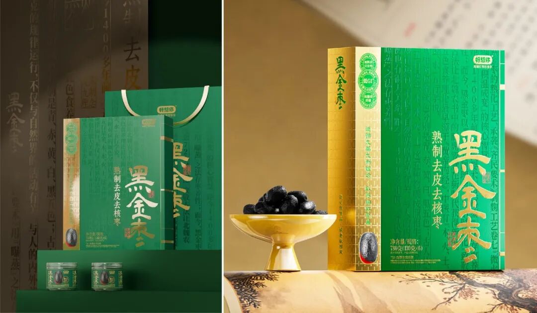 新罐头从 《黄帝内经》五色养生哲学中汲取灵感,确立 “黑入肾经,主补精力” 为核心视觉沟通元。并在设计上,规避了传统红枣的喜庆、民俗感,以库金色与荷叶绿为主色调,塑造低调、具有文化厚重感与现代高级感的视觉体系,支撑高端溢价感。