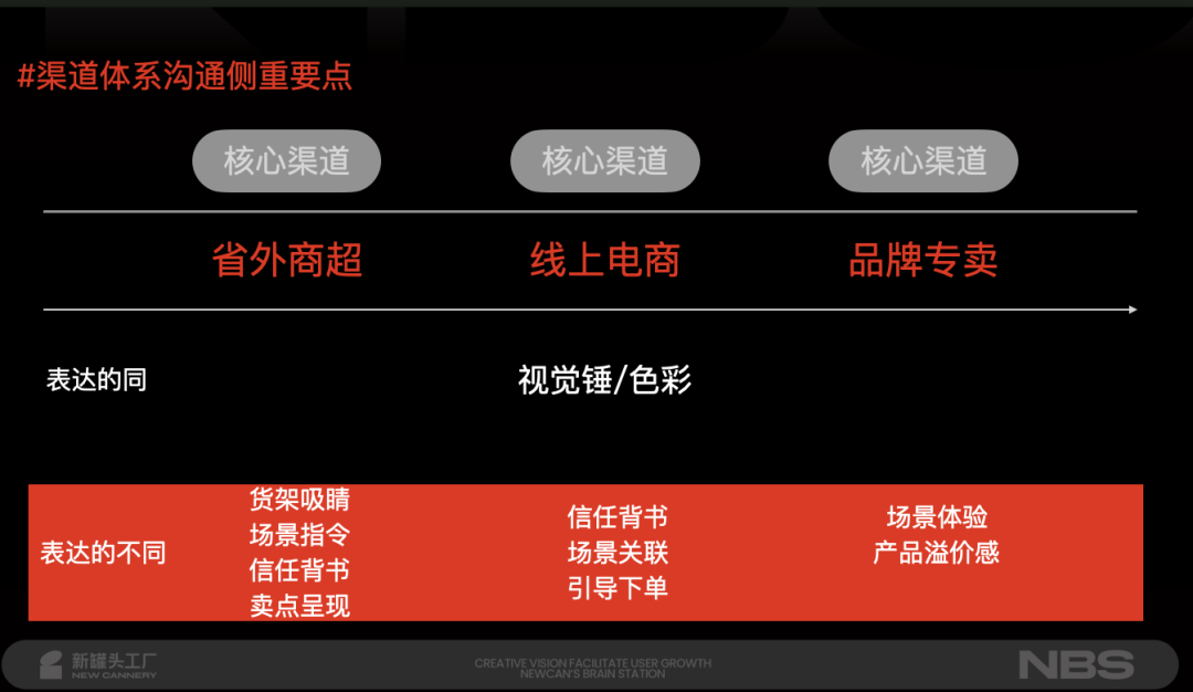 展开来讲,视觉策略在沟通上,相同的是以《黄帝内经》五色养生为文化母体。不同的是每个渠道体系有着各自的沟通侧重点。