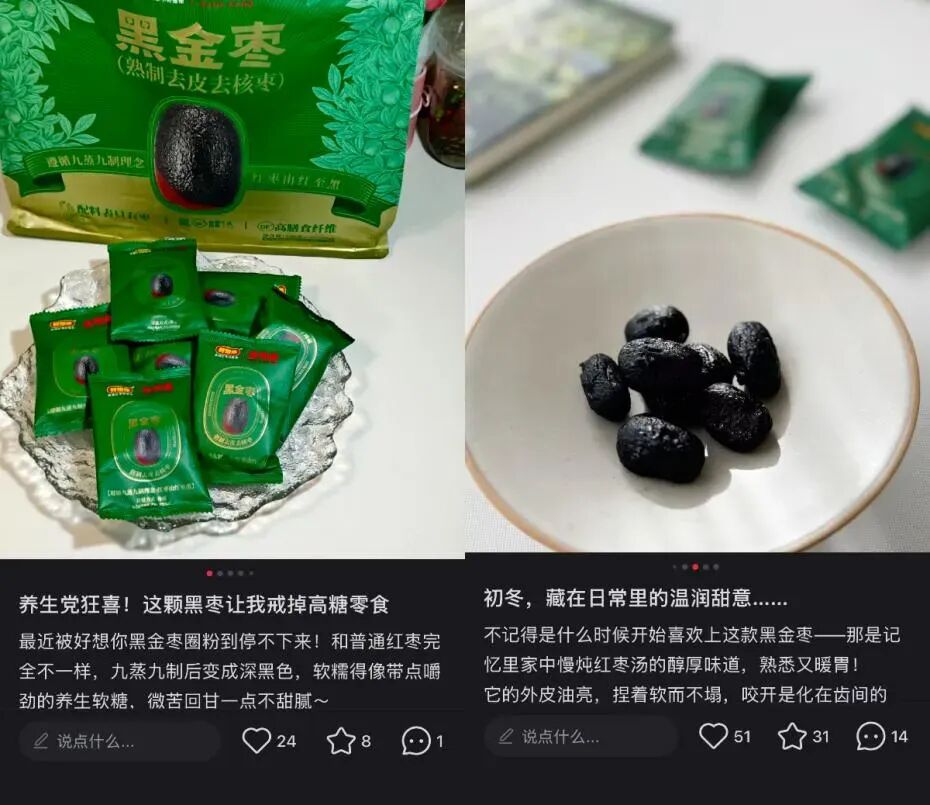 在社交平台上,也有不少尝试了“黑金枣”的用户进行分享。有爱养生的消费者被圈粉,也有人表示喜欢去核设计,彻底告别了吐核烦恼。还有用户表示黑产品食用场景多,在加班间隙、商务社交、休闲放松等不同时间都能随时来上一颗黑金枣,和朋友分享健康小零食。