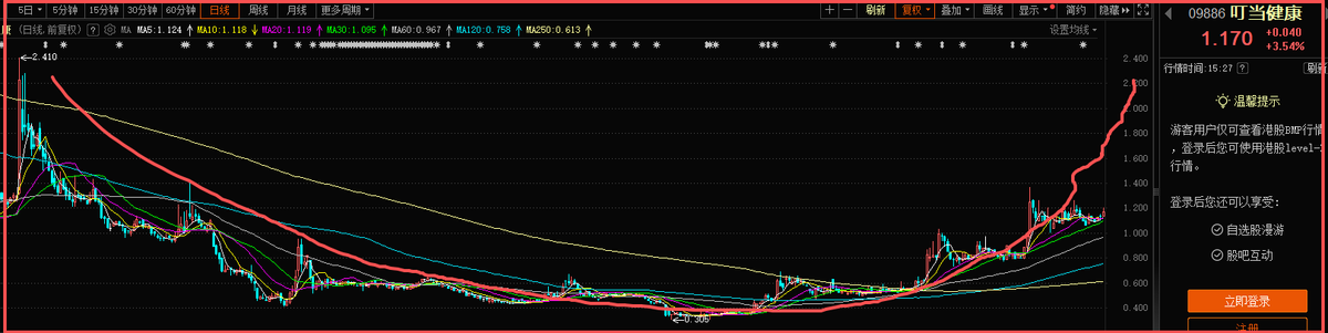 由于市场对医药即时零售的重估存在滞后,叮当健康目前的低估值已展现出典型的“黄金坑”特征。从技术面来看,5日、10日线的反复缠绕以及K线台阶式的上抬,形成老鸭头走势。