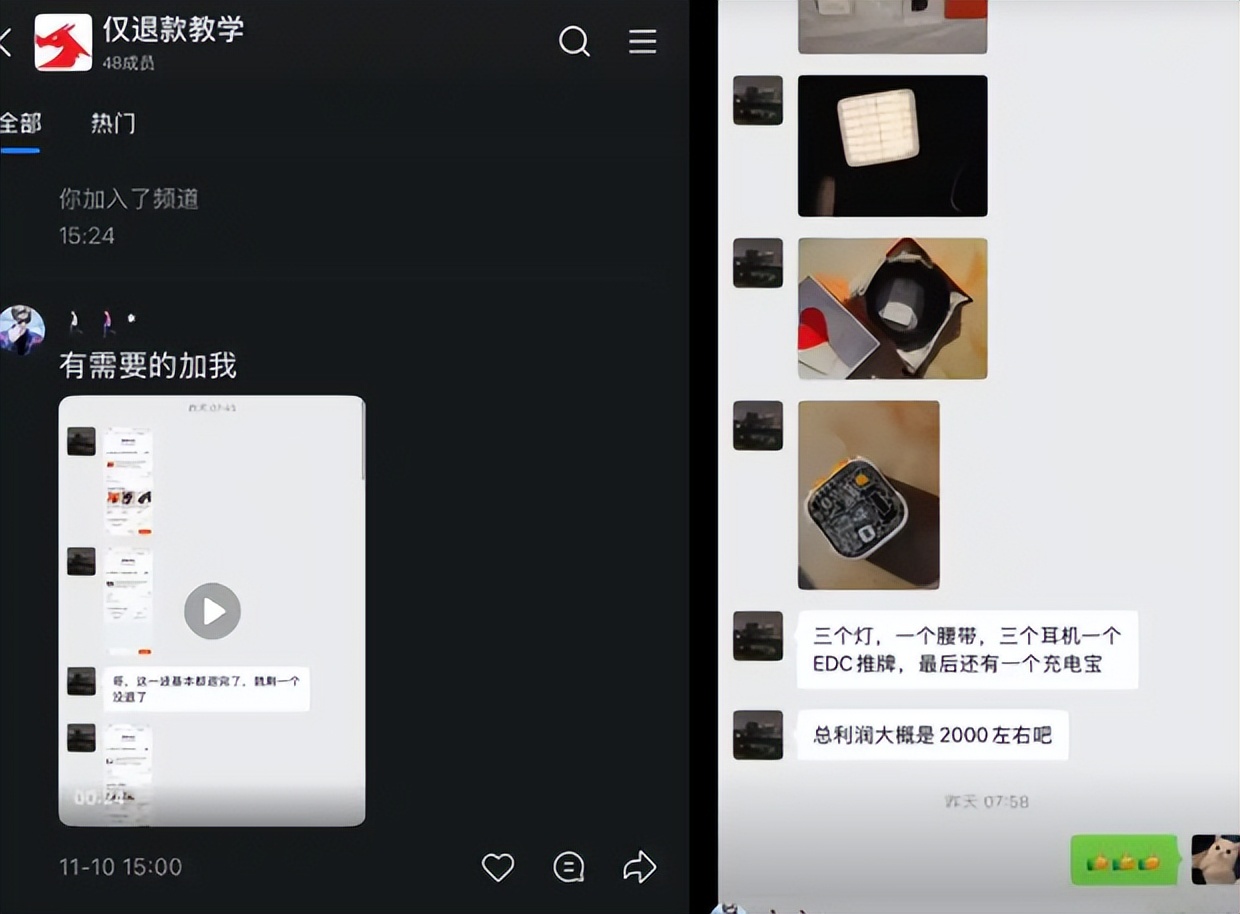 除利用AI软件制作假图外,围绕“仅退款”已衍生出更为系统的灰色产业。一个教学该“技术”的“师傅”表示支付288元学费即可传授“仅退款”窍门,并宣称一个账号约可成功退款30次。
