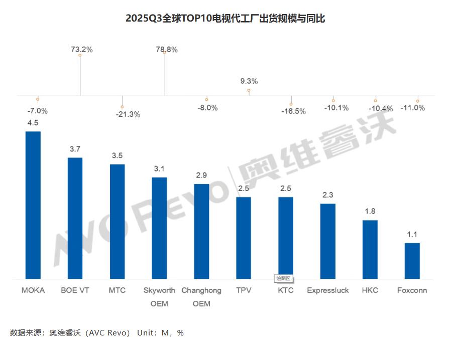 值得关注的是,在前十家代工厂中,仅有三家实现正增长,其余多数厂商出现下滑。特别是排名第一、第三和第五的MOKA(茂佳)、MTC(兆驰)和Changhong OEM(长虹)这三家处于行业前列的企业,在本季度均录得同比下滑,各自陷入经营压力。