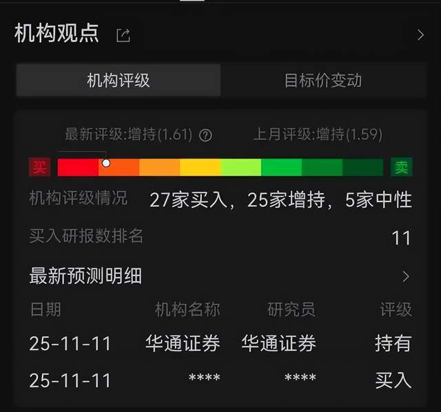 创新业务高歌猛进,手机×AIoT这个基本盘,表现依然稳健,总收入841亿元,同比增长1.6%,占到总营收的74.4%。其中,智能手机业务收入460亿元;IoT与生活消费产品业务收入276亿元,同比增长5.6%;互联网服务收入94亿元,同比增长10.8%。财报显示,2025年第三季度,小米智能手机出货量为4330万台,实现连续九个季度同比增长。Omdia数据显示,该季度小米全球智能手机出货量保持前三,市场份额13.6%。用户规模方面,到9月,小米全球月活跃用户数达7.42亿,中国大陆月活跃用户达1.87亿,双双创下历史新高。尽管近期股价承压,但不少头部机构仍对小米业绩长期发展持看好态度。Wind数据显示,在财报发布前,已有27家机构给予“买入”评级,25家给出“增持”评级。最新一致目标价64.06港元,预计上涨空间57.08%,反映出对小米增长潜力的高度期待。