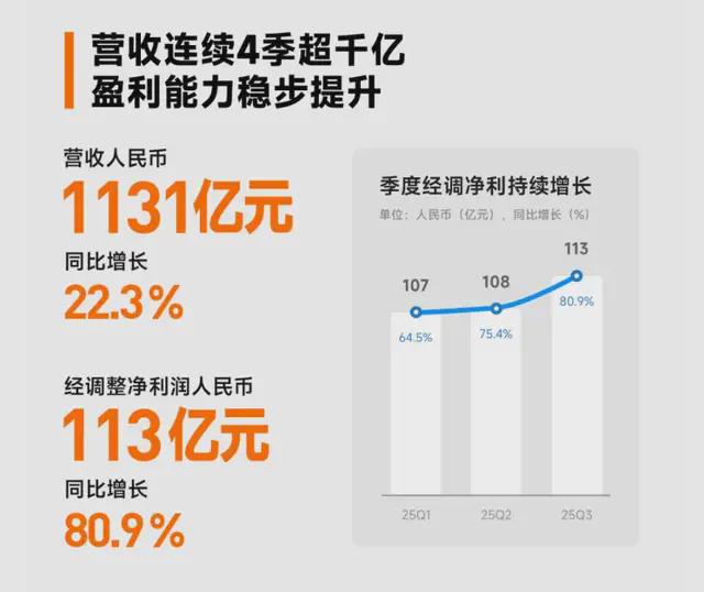 11月18日晚间,小米集团发布了2025年三季报,单季营收1131亿元,同比增长22.3%,连续4个季度突破千亿;经调净利润113亿元,同比大增80.9%。