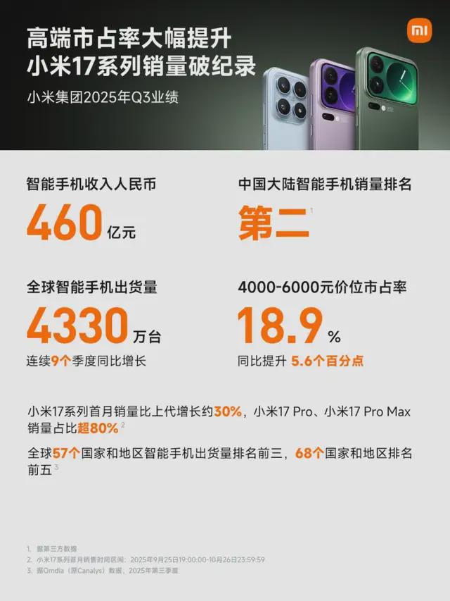 汽车、出海、高端化,小米的想象力刚打开事实上,三季报的优异表现只是一个开端。汽车、出海与已初见成效的高端化,共同构成了驱动小米未来的“三驾马车”。首先,小米手机的高端化战略,已经让过去只能作为追赶者的国产旗舰们,打破了苹果在高端市场的首销优势,实现同台竞技。其次,汽车业务的发展,也已经成为小米的核心之一。目前市场对于小米汽车的质疑,主要来自产品力。如今,小米的财报,是用SU7和YU7的产品力证明自己。而随着小米汽车的产品力,越来越精进,所有的舆情都将会是短暂的。明年,产能提升、新车型投放、盈利能力优化,都意味着小米汽车,有着更大的想象空间。最后,出海正成为小米业绩增长的关键。对于消费电子,规模最重要,没有任何世界级的车厂,只专注单一国家或者区域的。所以,出海对于小米汽车的订单、产能、毛利都会带来全新的竞争力。目前,小米正将国内验证成功的“人车家全生态”模式,系统性地复制到海外。其核心抓手,便是在全球范围内构建庞大的新零售网络,五年内在全球建设1万家海外小米之家。这条“高速公路”一旦铺就,不仅能为手机、家电等成熟产品打通渠道,更将为未来智能汽车的出海铺平道路。事实上,这一规划已经在逐步变为现实。几天前的11月6日,卢伟冰曾晒出他在德国试驾的最新进展。期间,他在德国境内部分不限速高速公路,对小米SU7进行了高速性能测试,实测时速达到260km/h,车辆整体表现稳定,操控与底盘调校均展现出良好素质。据报道,这次试驾,正是为小米汽车2027年正式进入欧洲市场,所做的前期技术验证与适应性测试。回看小米的发展历程,它总能在质疑声中实现新一轮的爆发。这次的财报就是一个强烈的信号:小米的增长故事非但没有见顶,其最富想象力的章节,才刚刚开始。•END•