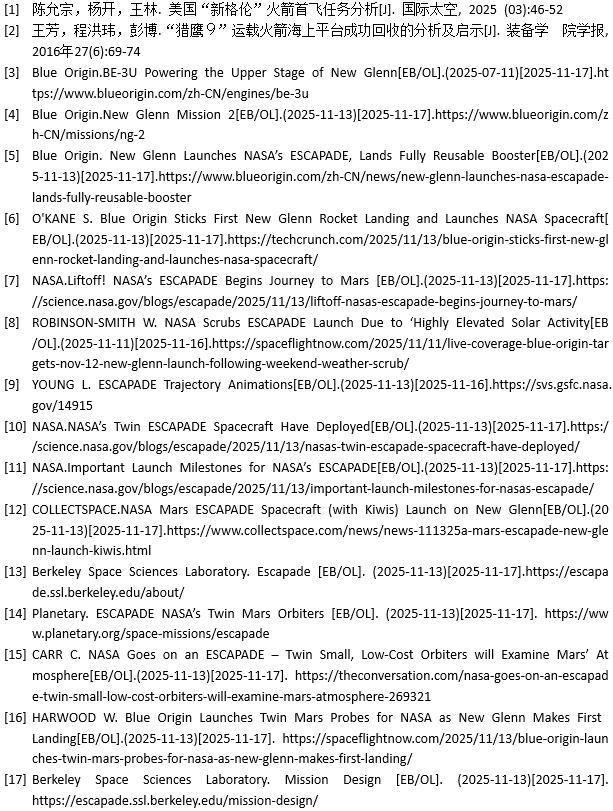 “新格伦”火箭第二次任务完成三项预定目标:成功发射ESCAPADE 火星探测任务,实现第一级回收,完成卫讯公司发射遥测数据中继服务技术飞行验证。此次任务的成功是蓝源公司从亚轨道飞行(“新谢帕德”)迈向大型轨道发射和深空探测的关键一步,标志着蓝源公司进入全新的发展阶段。“新格伦”火箭第一级的着陆回收使蓝源公司成为继 SpaceX 公司之后,第二家实现轨道级液体火箭第一级海上回收的美国商业航天公司。接下来,蓝源公司还需证明其能够翻新复用火箭第一级。