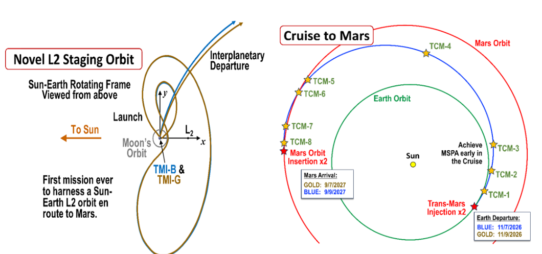 ESCAPADE任务原计划在2024年10月的火星任务发射窗口期发射。2024年8月,双子火星轨道器抵达发射场。由于“新格伦”运载火箭技术问题导致进度推迟,错过火星任务发射窗口。ESCAPADE任务最终推迟到2025年11月。按最新任务设计方案,新格伦火箭将双子火星轨道器送入“接近地球逃逸速度”的大椭圆轨道,双子火星探测器依靠自身推力进入围绕地球-太阳拉格朗日点2(L2)运行的芸豆形“徘徊”轨道,开展大约1年的空间天气研究;随后,在2026年11月利用奥伯特效应奔向火星,经过霍曼II星际转移轨道飞行及多次“轨道修正机动”(TCM)后,在2027年9月抵达火星。