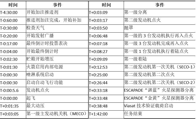 第二级在“接近地球逃逸速度”的大椭圆轨道部署ESCAPADE双子火星探测器:发射后33min18s,部署“湛蓝”火星探测器;30s后,即发射后33min48s,部署“金黄”探测器。卫讯公司的演示验证在 发射后38min48s开始,持续到发射后1h41min54s,任务正式结束,上面级进入日心处置轨道。