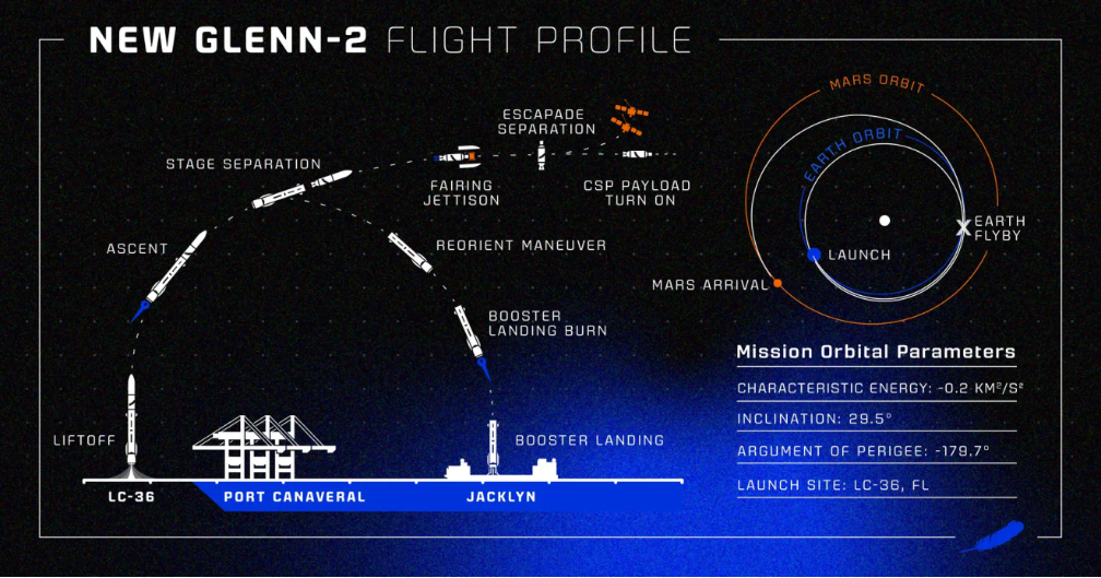 “新格伦”火箭在第二次任务中为NASA发射火星大气逃逸、离子加速、动态探测任务(ESCAPADE)双子火星轨道器,同时为卫讯卫星通信公司进行技术演示验证。