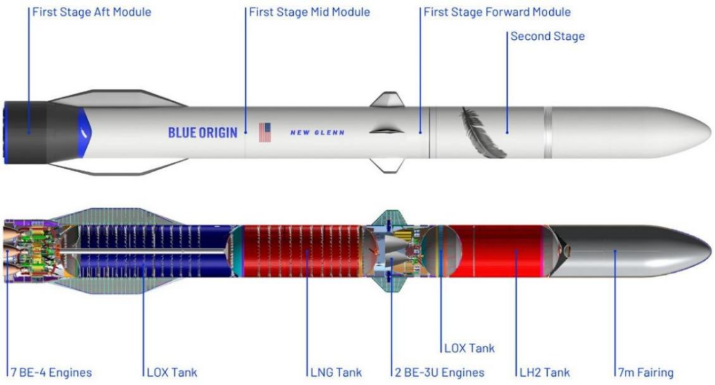 “新格伦”火箭采用串联式布局,全箭高98m,直径7m,由第一级、第二级和有效载荷整流罩三部分组成。该火箭设计可从卡纳维拉尔角和范登堡太空军基地发射,近地轨道(LEO)运载能力为45t,地球静止转移轨道(GTO)运载能力为13.6t,地月转移轨道(TLI)运载能力达7t。