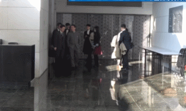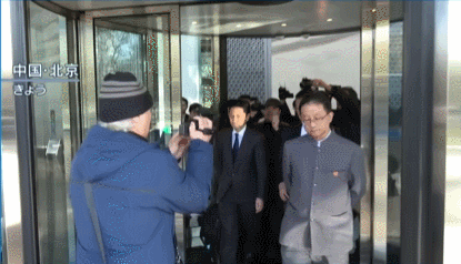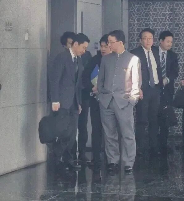 会议结束后,双方下楼走出电梯说了几句话,这短短的十几秒被记者们拍到,画面中刘劲松身穿五四青年装,胸口带着国徽,双手插兜,一脸严肃的扭头看着金井正彰说话。