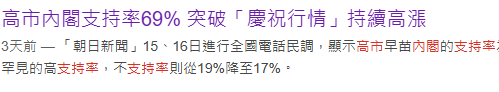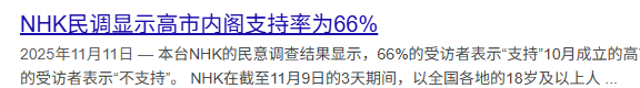 一般来说,新首相上台之后,内阁支持率会在第二次民调出现下滑。但这几天民调显示,高市的内阁支持率不降反增,而且在短短几天内,升到了历史最高,超过10月份刚当首相时的第一次民调68%支持率。