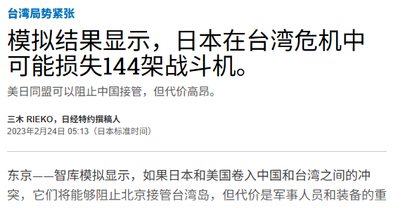 在2023年,日本智库做了“台海有事”兵棋推演,设想的是2026年中国大陆“武统”台湾,日本和美国介入冲突阻止解放军。推演结果是“经过2周作战,解放军补给线被切断,日美联军取得台湾制空权,成功阻止解放军武统台湾,解放军被重创”。