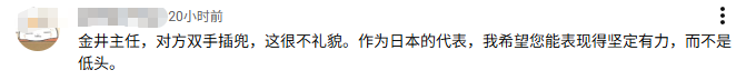这幅画面在中日互联网上均引起轩然大波,我们这边普遍说刘司长的姿态配上青年装真的太帅了。而日本网友则非常生气,基本上是各种辱骂,说中国外交官“傲慢”、“没素质”、“没礼数”等各种难听词语,还有不少人指责金井正彰在面对中国时显得太“卑微”,为什么要鞠躬,丢了日本的脸。