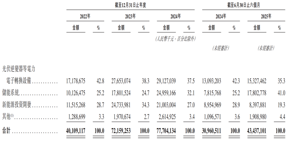 招股书显示,储能系统业务收入在2025年上半年同比暴增127.78%至178.03亿元,占营收的比例同比增长15.5个百分点至41.0%。相比之下,作为曾经的核心业务,光伏逆变器业务收入同比增长仅17.06%至153.27亿元,占营收的比例同比下降7个百分点至35.3%。这标志着阳光电源的增长引擎已完成切换,储能系统业务正逐步成长为新的增长支柱。