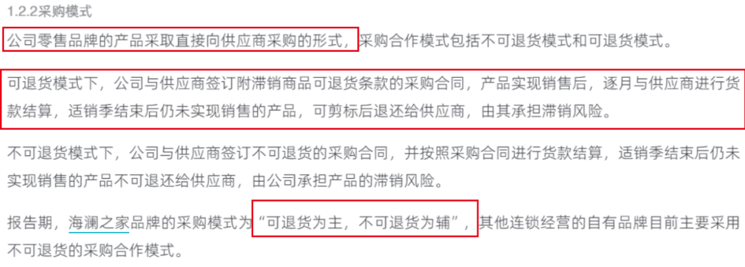 在销售终端,海澜之家离不开广大加盟体系的支持;在生产端,公司零售品牌的产品直接向供应商采购。其中,「海澜之家」品牌主要采用可退货模式,在这一模式下,公司可以将滞销的商品剪标后退还给供应商,由供应商承担滞销风险。