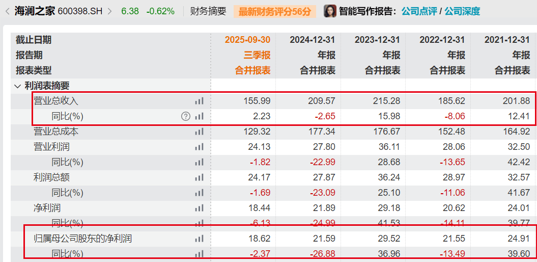 近日,海澜之家发布2025年三季报。报告期内,公司实现营收156亿元,同比微增2.23%;归母净利润18.62亿元,同比下滑2.37%。