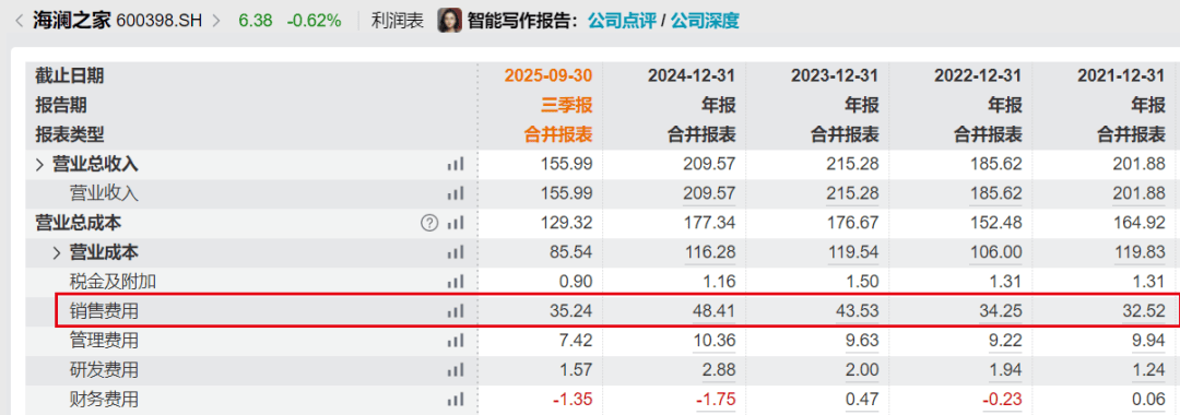 2021年至2025年前三季度,海澜之家的销售费用分别为32.52亿元、34.25亿元、43.53亿元、48.41亿元及35.24亿元。短短不到5年时间,公司已经在营销上花了约194亿元。