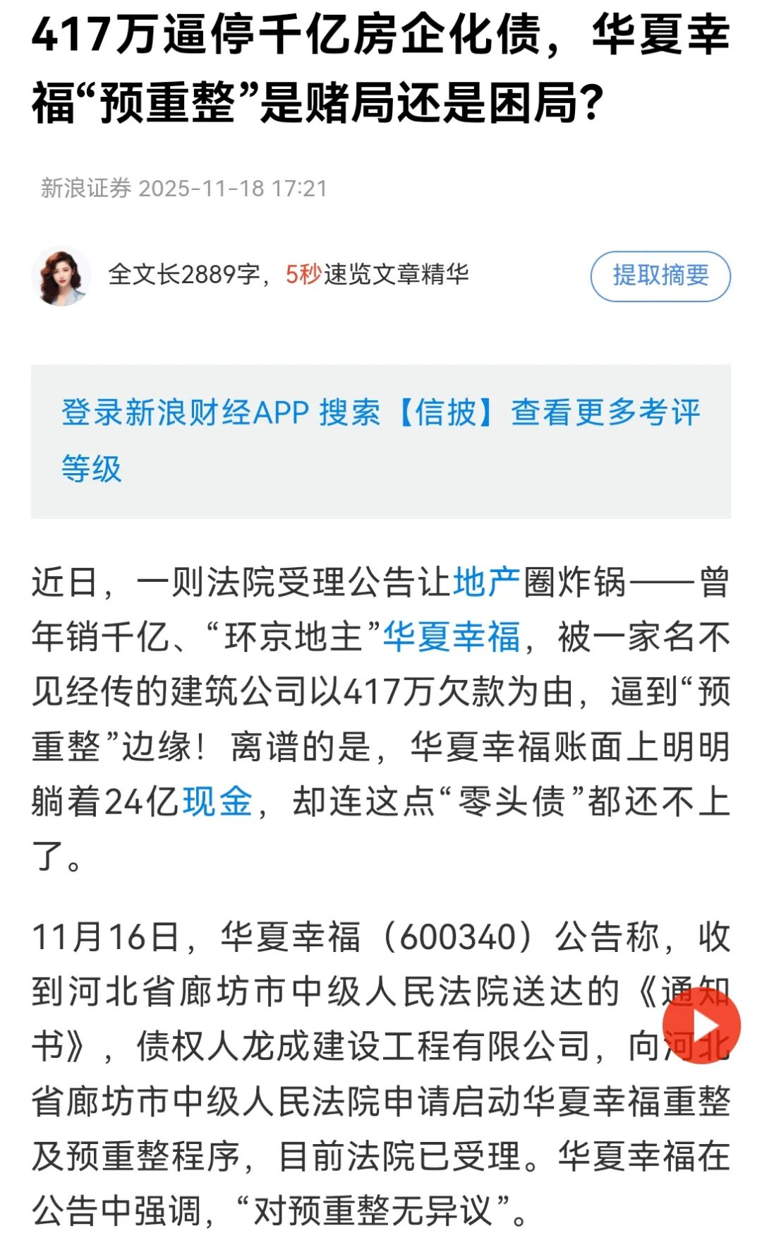 华夏幸福(600340.SH)让一笔小小的417万元欠款,给逼到了“预重整”的边缘。